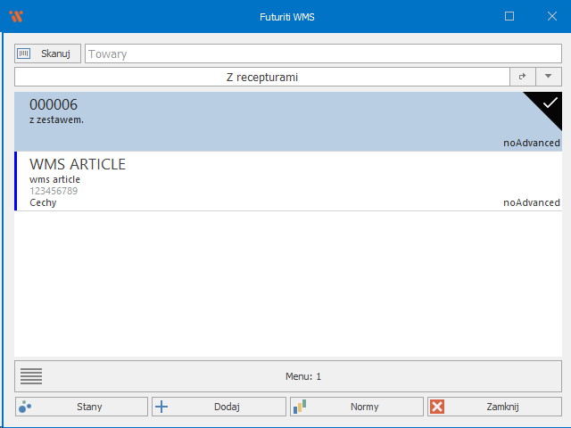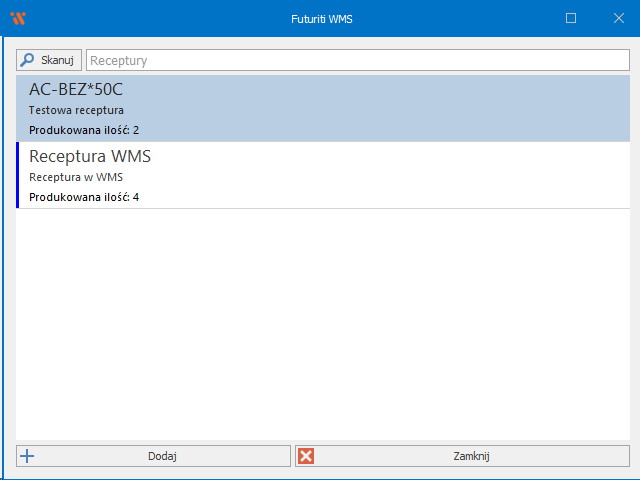 Receptury utworzone w WMS są oznaczone niebieskim paskiem.