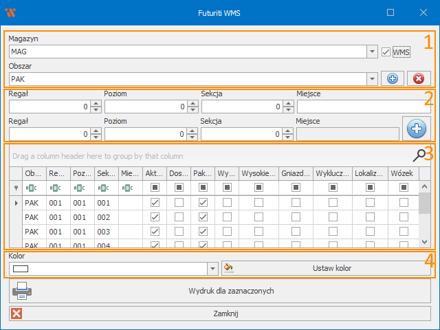 - Ustaw kolor – ustawia wybrany kolor na zaznaczonych w podglądzie struktury magazynu lokalizacjach