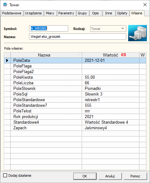 ValueText [tw__Towar].[tw_Pola1…8][#3] Dla pola standardowego.