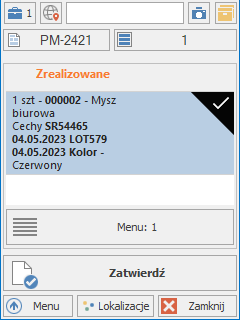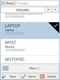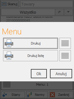 Po zaznaczeniu towaru pojawi się przycisk Menu, wybierz nowo wyświetlony przycisk, zostanie wyświetlone menu wyboru wydruku tak jak opisane w punkcie poprzednim