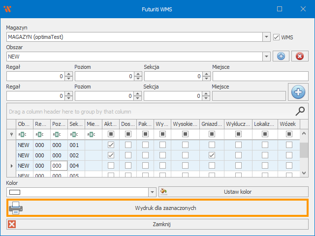 W tym celu przejdź do formatki, wybierz obszar, dla którego należy wydrukować etykietę lokalizacji następnie zaznacz odpowiednie lokalizacje w tabeli i wybierz opcję Wydruk dla zaznaczonych