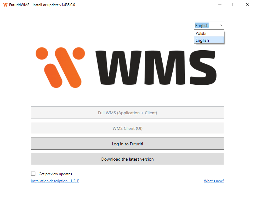 Wybór języka jest dostępny w instalatorze jako lista rozwijana w prawym górnym rogu aplikacji, po wyborze języka interfejs jest automatycznie tłumaczony na wybrany język