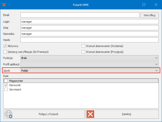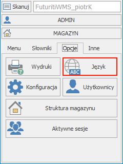Możliwa jest również zmiana języka z poziomu menu głównego Futuriti WMS: Zakładka Opcje → Język